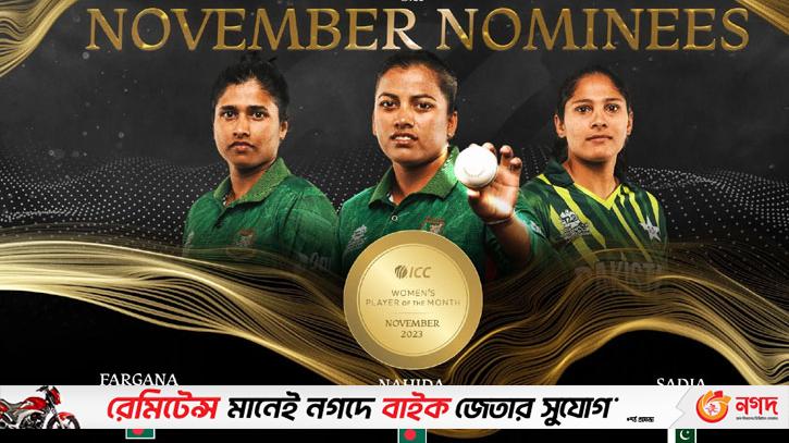 আইসিসি আজ বৃহস্পতিবার নভেম্বর মাসের সেরা খেলোয়াড়দের সংক্ষিপ্ত তালিকা প্রকাশ করেছে। সেই তালিকায় জায়গা করে নিয়েছেন বাংলাদেশের দুইজন নারী ক্রিকেটার। তার একজন অভিজ্ঞ ব্যাটার ফারজানা হক পিংকি। আর অন্যজন স্পিনার নাহিদা আক্তার। এই তালিকায় জায়গা পাওয়া অপরজন হলেন পাকিস্তানের বাহাতি স্পিনার সাদিয়া ইকবাল।